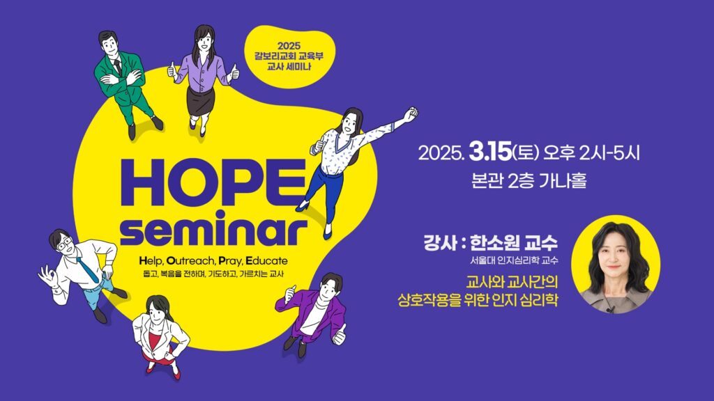 교육부 교사 세미나가 오는 토요일 3월 15일 오후 2시부터 5시까지 본관 2층 가나채플에서 진행됩니다.이번 교사 세미나에서는 서울대 인지심리학과 한소원 교수님의…
