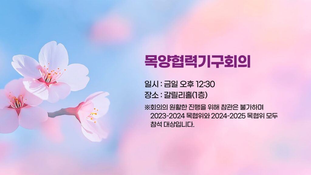 일시: 금일 오후 12:30장소 : 갈릴리홀(1층)※회의의 원활한 진행을 위해 참관은 불가하며 2023-2024 목협위와 2024-2025 목협위 모두 참석 대상입니다.