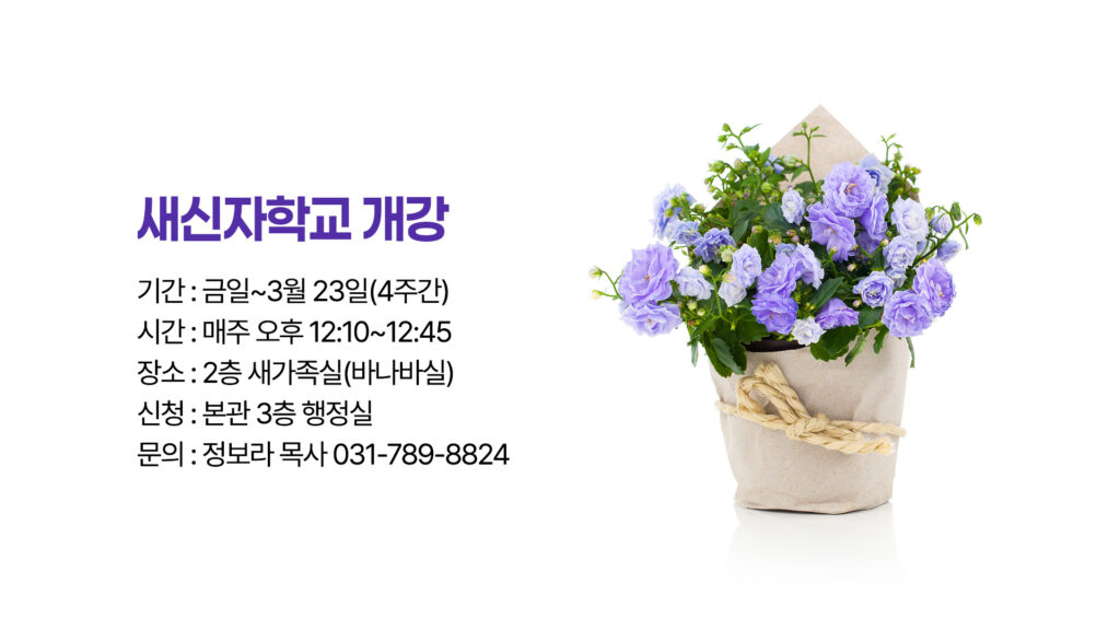 금일부터 새신자학교가 개강됩니다.3월 23일까지 4주간, 매 주일 오후 12시 10분부터 12시 45분까지 2층 바나바실에서 진행됩니다.신청은 행정실에서 하실 수 있습니다.