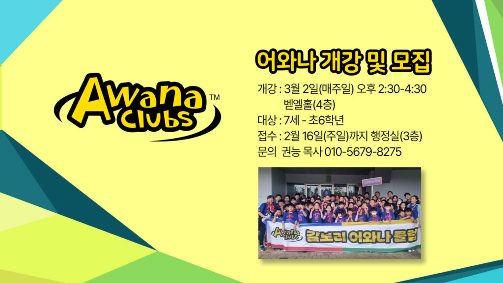 2025년 어와나 단원을 모집합니다. 게임과 다양한 활동을 통해 말씀을 배우고 암송하며 믿음의 세대로 키워가는 어와나에 많은 관심과 지원 바랍니다. 접수는 2월 16일까지입니다.