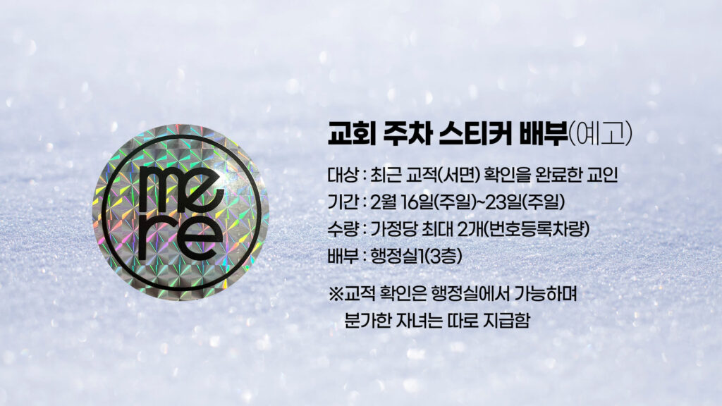 대상 : 최근 교적(서면) 확인을 완료한 교인 기간 : 2월16일(주일)~23일(주일) 수량 : 가정당 최대 2개(번호등록차량) 배부: 행정실1(3층) ※ 교적 확인은…