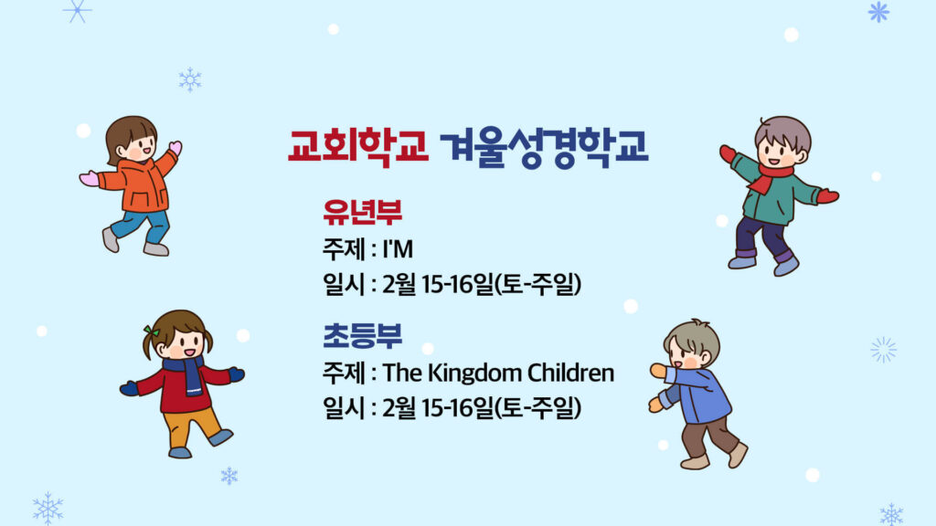 유년부, 초등부 겨울 성경학교가 2월 15일부터 16일까지 진행됩니다. 유년부는 ‘I’m’이라는 주제로, 초등부는 ‘The Kingdom Children’이라는 주제로 진행됩니다. 많은 관심과 참여, 기도 부탁드립니다.