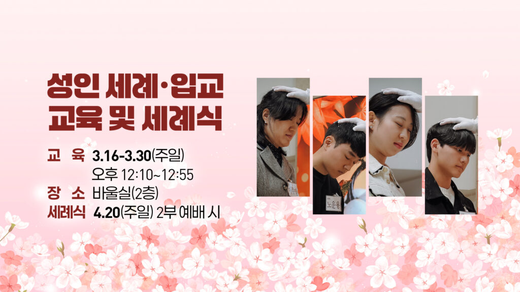 교육 : 3.16-3.30(주일) 오후 12:10~12:55장소 : 바울실(2층)세례식 : 4.20(주일) 2부 예배 시