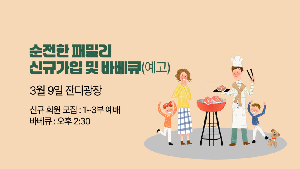 3월 9일 주일에는 ‘순전한 패밀리’ 신규 가입 및 바베큐 모임이 있습니다.1부터 3부 예배까지 교회 앞 잔디광장에서 신규 가입 행사가 진행되며,…