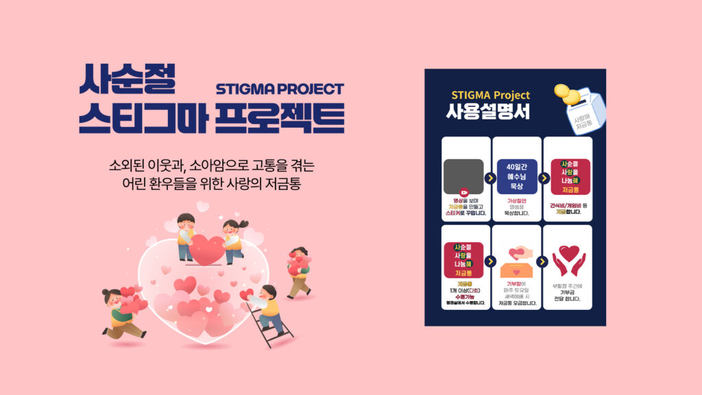 이번 사순절 기간 교육부에서는 그리스도의 사랑과 흔적을 나누는 스티그마 프로젝트를 진행합니다.특별히 ‘사랑해 저금통’ 기부를 통해서 소외된 이웃과, 소아암으로 고통을 겪는…