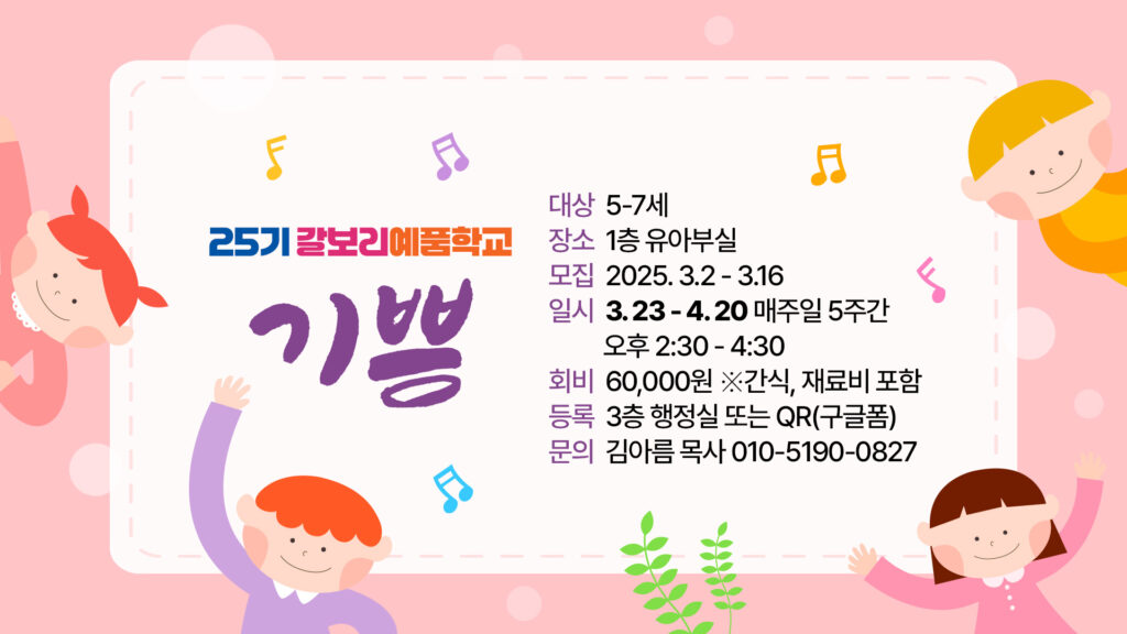 예품학교 25기 어린이와 교사를 모집합니다."기쁨"이라는 주제로 예수님의 성품을 배우며 성장하는 예품학교는 오는 23일부터 4월 20일까지 5주간 매 주일 오후 2시…