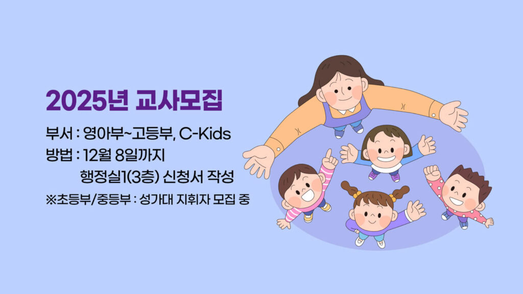 2025년 갈보리교회 교회학교를 섬길 교사들을 모집합니다.예수님의 사랑으로 말씀을 교육하며 그리스도의 제자로 함께 세워져 가기를 바라는 많은 분들의 관심과 참여를 부탁드립니다.