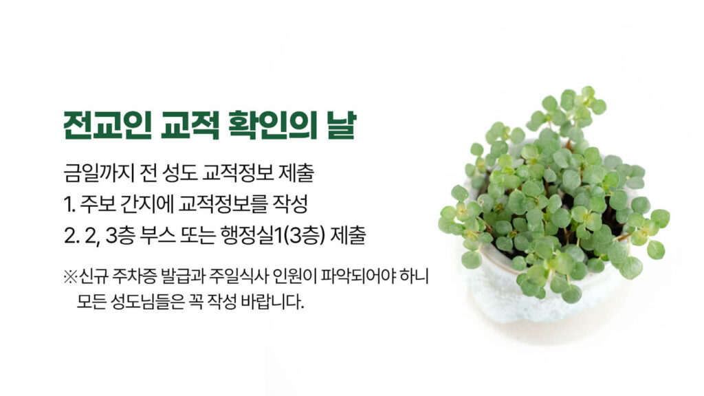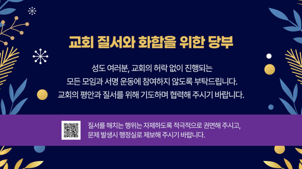 성도 여러분, 교회의 허락 없이 진행되는 모든 모임과 서명 운동에 참여하지 않도록 부탁드립니다.교회의 평안과 질서를 위해 기도하며 협력해 주시기 바랍니다.…