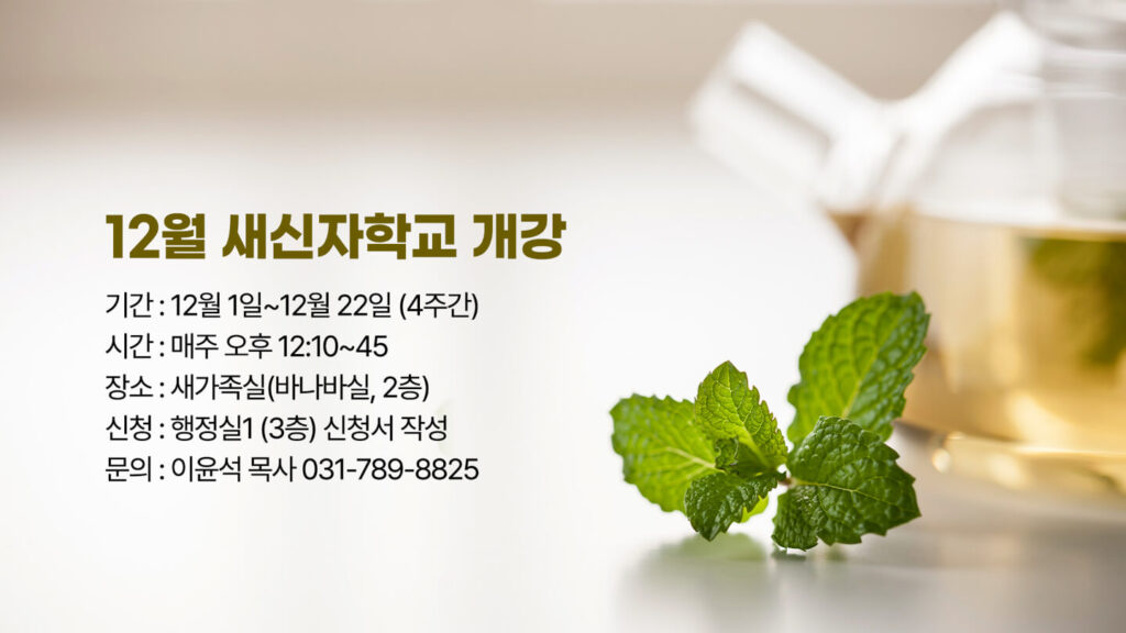 12월 새신자 학교를 개강합니다.기간은 12월 1일~12월 22일까지 총 4주간, 매주 주일 오후 12:10~12:45까지 2층 바나바실에서 교육이 진행될 예정입니다.신청은 3층 행정실에서…