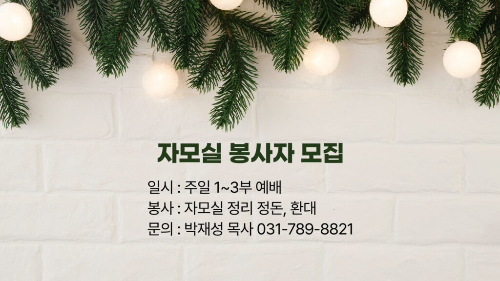 일시: 주일 1~3부 예배봉사: 자모실 정리 정돈, 환대문의: 박재성 목사 031-789-8821