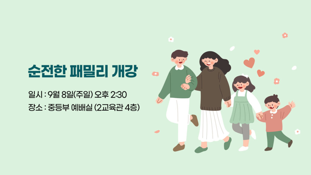순전한 패밀리 개강 소식입니다.9월 8일 주일 오후 2시 2교육관 4층 중등부 예배실에서 정기모임을 진행합니다.이번 학기는 신앙의 기초를 쌓는 가정 입니다.가정…