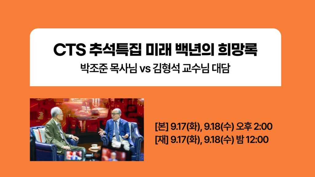 이번 추석 연휴 CTS에서는 추석을 맞이해 갈보리교회 원로목사이신 박조준 목사님과 연세대학교 김형석 명예교수님의 원로대담 <미래 백년의 희망록>을 방송 예정 중에…