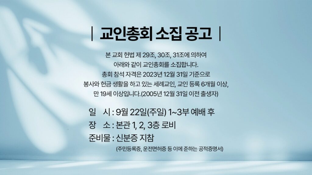 본 교회 헌법 제 29조, 30조, 31조에 의해 교인총회를 소집합니다.날짜는 9월 22일 1~3부 예배 후 본관 2~3층 로비입니다.총회 참석할 수…