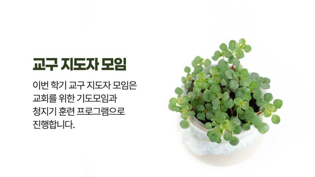 이번 학기 교구 지도자 모임은 교회를 위한 기도모임과 청지기 훈련 프로그램으로 진행합니다.
