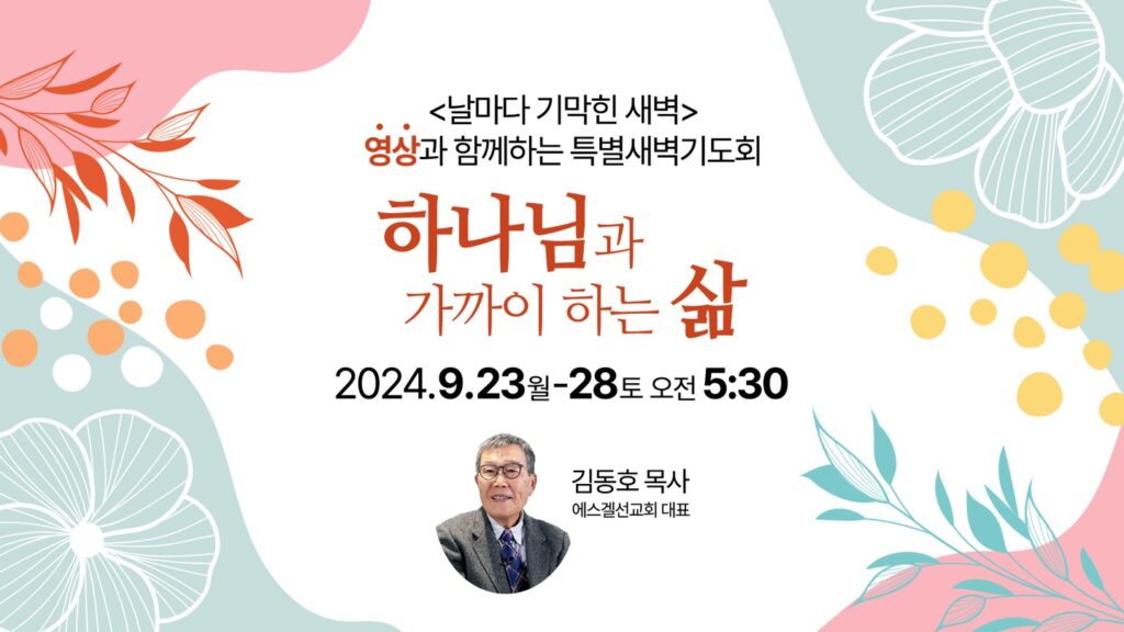 9월 23~28일은 “하나님과 가까이 하는 삶”이란 주제로 특별새벽기도회를 진행합니다.이 날의 말씀은 특별히 김동호 목사님의 “날마다 기막힌 새벽”의 영상을 통해 말씀으로…
