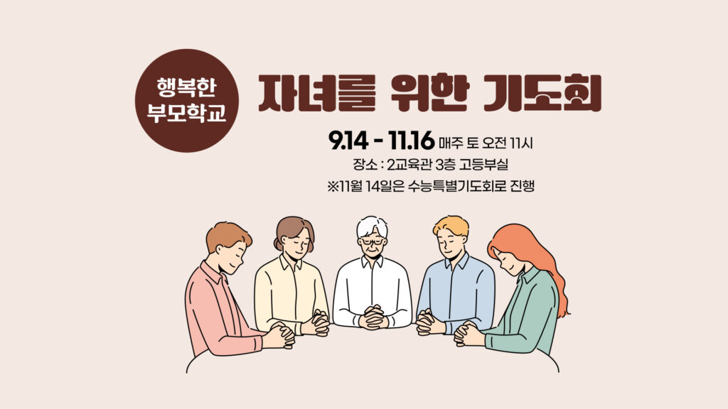9월 14일 행복한 부모학교가 2학기 개강합니다.이번 행복한 부모학교는 자녀를 위한 기도회로 매주 토요일 오전 11시 2교육관 3층 고등부실에서 진행됩니다.기도하는 부모님들의…