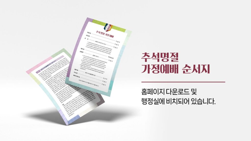 홈페이지 다운로드 및 행정실에 비치되어 있습니다. 추석명절 가정예배 순서지 다운로드