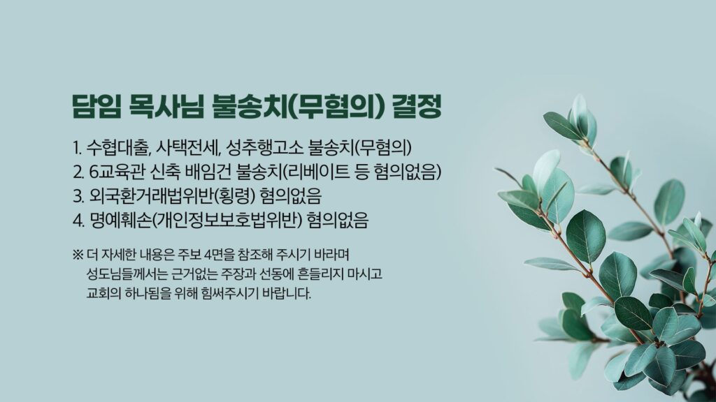 10월 5일 목양협력기구회의에서 아래 안건들이 상정되어 과반수 이상 찬성으로 통과 되었습니다. 안건 1갈보리교회 재정운영에 필요한 은행 계좌를 재정부의 개인의 명의로…