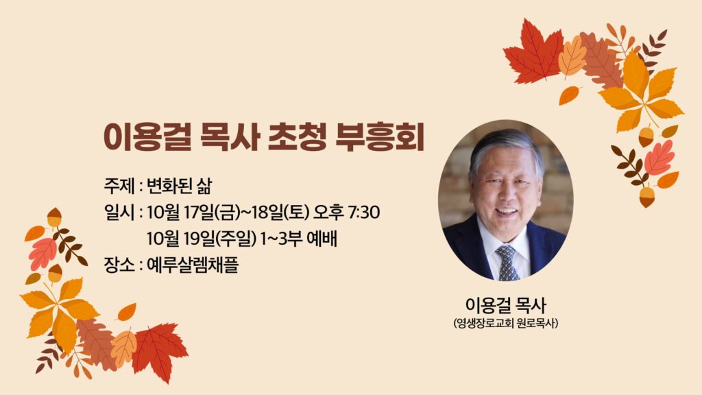 주제 : 변화된 삶일시 : 10월 17일(금)~18일(토) 오후 7:30, 10월 19일(주일)1~3부 예배장소 : 예루살렘채플