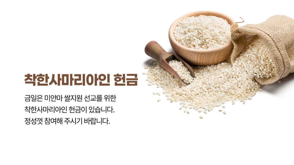금일은 미얀마 쌀 지원 선교를 위한 착한 사마리아인 헌금이 있습니다.미얀마 선교를 위해 기도하는 마음으로 참여해 주시기 바랍니다.