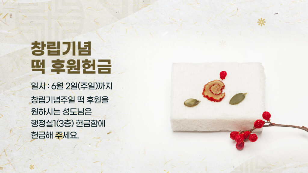 다가오는 6월 2일은 갈보리교회가 세워진 지 39년이 되는 창립기념 주일입니다.풍성한 이날을 위해 6월 2일까지 떡 후원금을 받습니다.하나님께서 이 교회를 세우신…