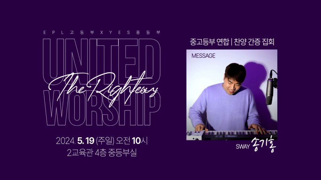 돌아오는 주일인 5월 19일에는 중고등부의 연합예배가 있습니다.작곡가겸 프로듀셔이신 송기홍 대표님이 오셔서 청소년들에게 귀한 간증과 찬양으로 은혜의 시간을 나누고자 합니다.이 땅의…