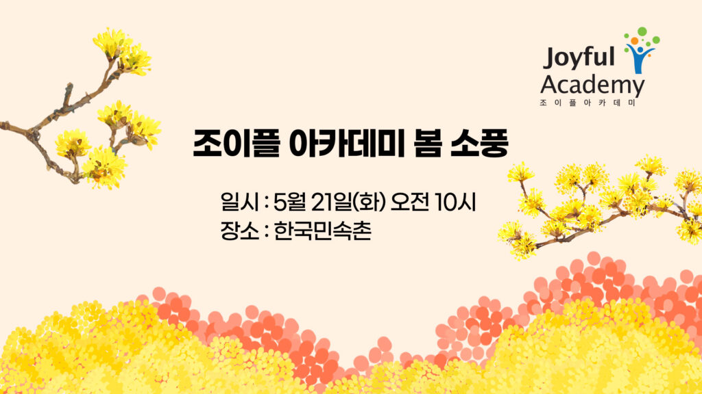 다음 주 화요일 조이플 아카데미에서는 한국민속촌으로 소풍을 나갑니다.옛 정서를 느끼고 또 체험해 보는 귀한 이날을 위해 화창하고 시원한 날씨가 준비되도록…