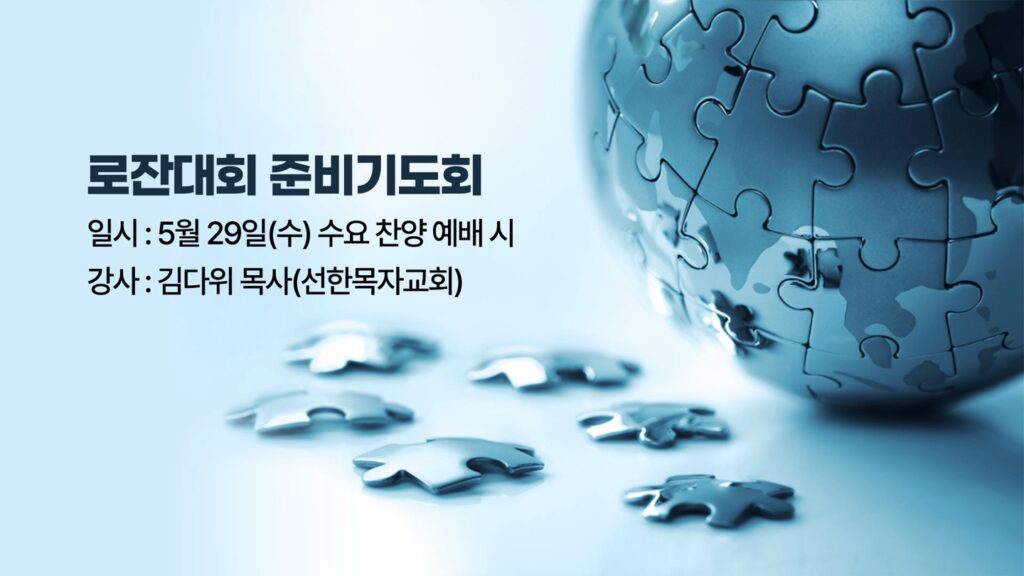 다음 주 수요일인 5월 29일은 로잔대회를 위한 준비 기도회가 있습니다.이를 위해 선한 목자교회 김다위 담임목사님께서 말씀을 전해주십니다.많이 참여하셔서 올해 9월에…