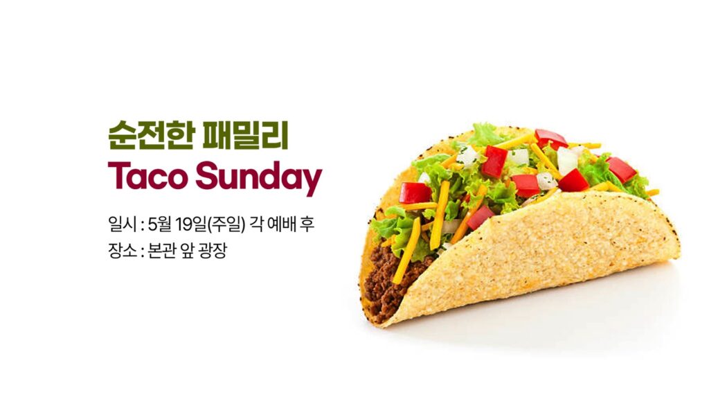 순전한 패밀리에서는 5월 가정의 달을 맞이하여 맛있는 타코를 나눠드립니다.돌아오는 5월 19일 잔디광장에서 진행되는 Taco-day에 많이 오셔서 맛있는 음식과 함께 귀한…