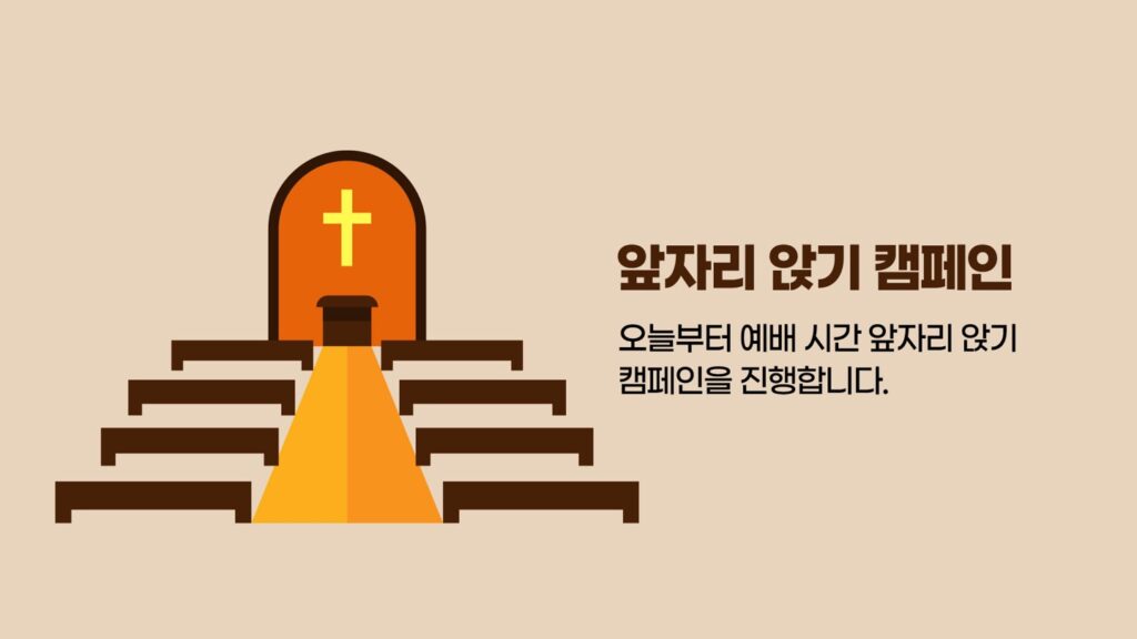 경건한 예배 모두 잘 드리고 계시나요?오늘부터 예배 시간 앞자리 앉기 캠페인을 진행합니다.예배당 곳곳에 비어 있는 앞자리, 주저하지 마시고 기대하는 마음으로…
