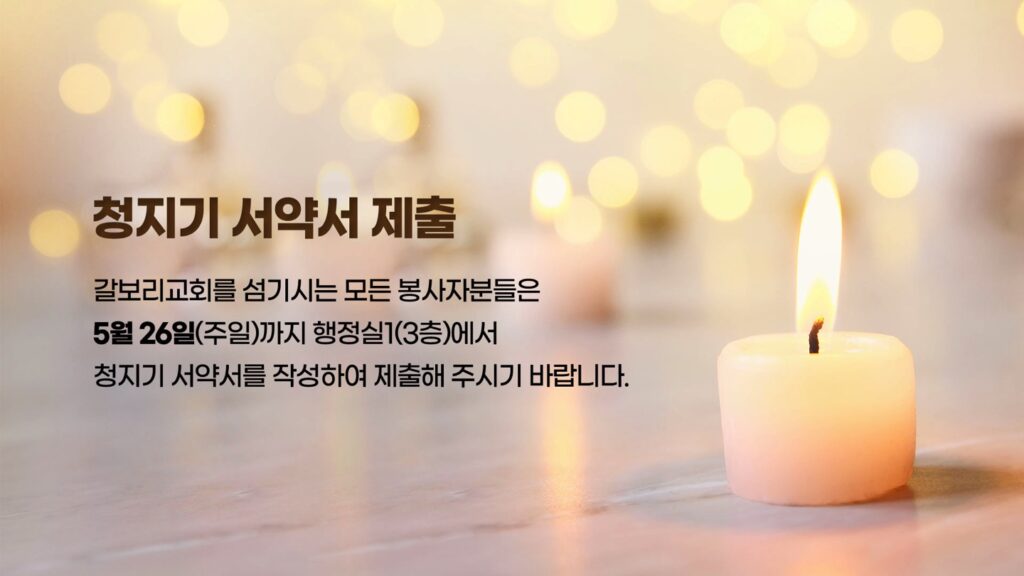 갈보리교회를 섬기시는 모든 봉사자분들은 5월 26일(주일)까지 행정실1(3층)에 청지기 서약서를 작성하여 제출해 주시기 바랍니다.