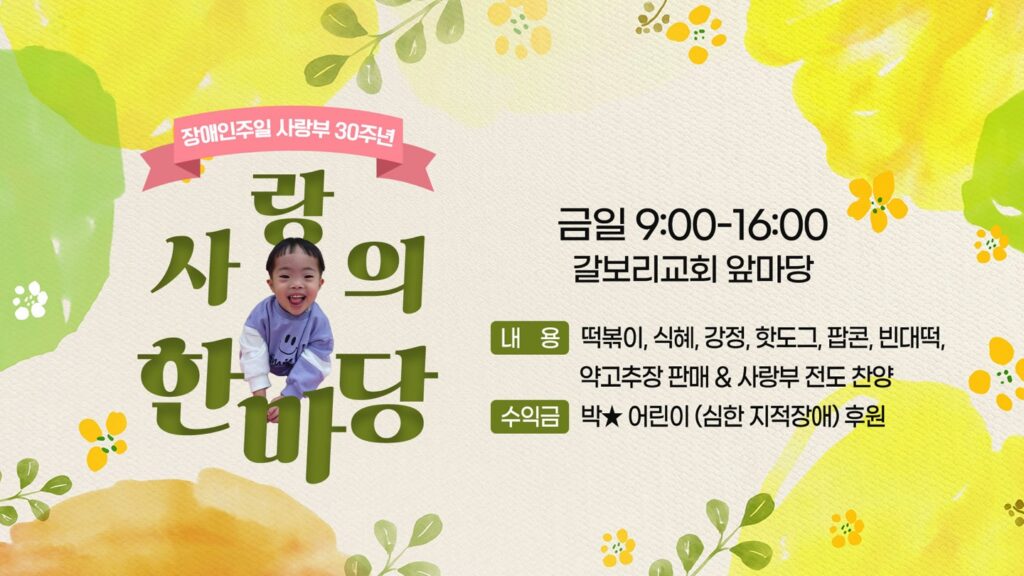 올해 사랑부가 30주년을 맞이했습니다. 장애인주일인 오늘은 특별히 오전 9시부터 오후 4시까지 교회앞 잔디광장에서 “사랑의 한마당”을 진행합니다. 모인 수익금은 무연고 장애아동의…