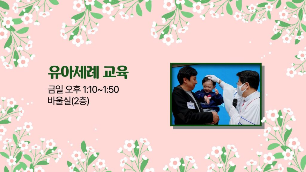 금일부터 유아세례 교육이 시작됩니다. 세례교육은 금일과 28일인 다음 주일 오후 1:10~1:50까지 2층 바울실에서 진행됩니다. 자세한 내용은 주보를 참고해 주시기 바랍니다.