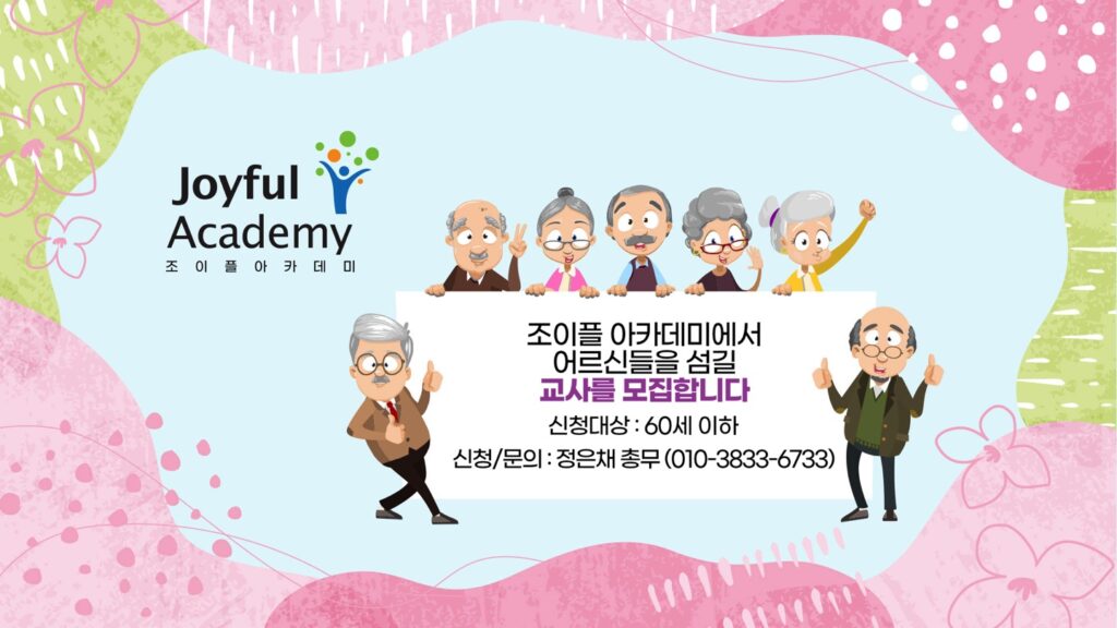 조이풀 아카데미에서 교사를 모집합니다.갈보리교회의 부모님과도 같은 신앙의 어른들을 사랑으로 섬기며 봉사하고자하는 분들은 누구나 지원하셔서 행복한 조이풀 아카데미를 만들어가길 바랍니다.