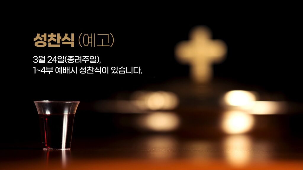 종려주일인 24일, 1부에서 4부예배때는 성찬식이 있습니다.십자가의 사랑을 통해 우리를 죄와 사망에서 구원하신 예수님의 은혜를 기억하는 복된 시간이 되시기를 바랍니다.