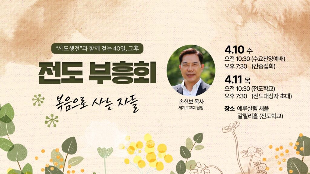 돌아오는 수요일과 목요일 오전 10:30과 저녁 7:30에 전도 부흥회가 진행됩니다. 세계로교회 손현보 목사님께서 말씀을 전해 주시며 특별히 목요일 오후7:30에는 전도대상자들을…