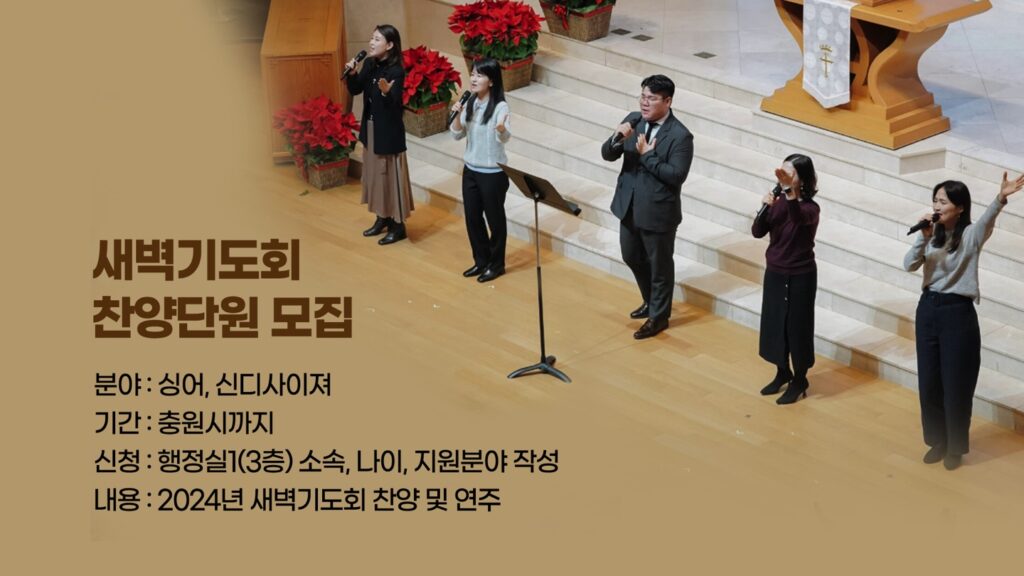 사순절의 은혜를 앞으로도 계속해서 지켜가기 원합니다. 찬양과 말씀으로 새벽을 깨우는 우리 갈보리교회 모든 성도님들이 되시길 축복합니다. 아울러 새벽기도회 찬양팀을 모집하오니…