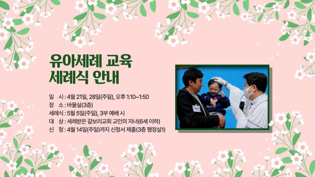 4월 14일까지 유아세례 신청을 받습니다. 신청은 3층 행정실에서 하실 수 있으며 자세한 내용은 주보를 참고해 주세요.