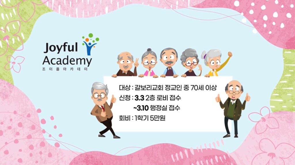 조이풀 아카데미를 모집합니다.갈보리교회 교인으로 70대 이상이신 분들은 모두 신청하실 수 있습니다.성경적이고 유익한 프로그램으로 함께 예배하며 교제하는 공동체입니다.신청은 3월 3일부터 3월…