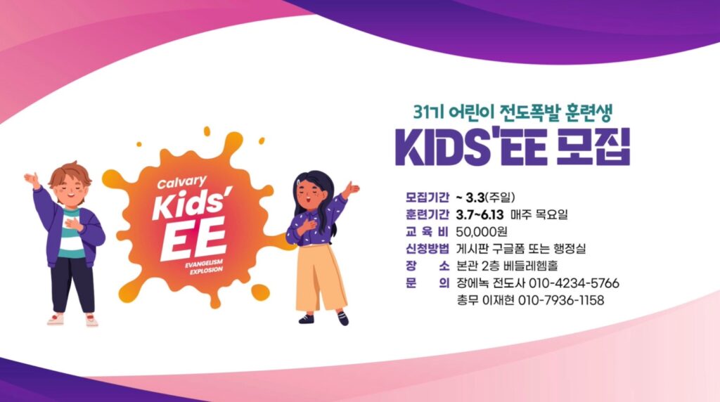 린이 전도폭발 Kids'EE 31기 단원을 모집합니다.대상은 초등학교 3학년부터 6학년까지이며 3월 7일부터 매주 목요일 14주간 진행됩니다.복음을 선명하게 심어주고 구원의 확신을 가지고…