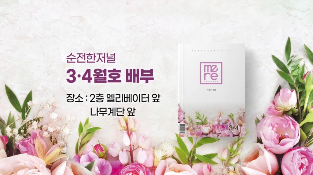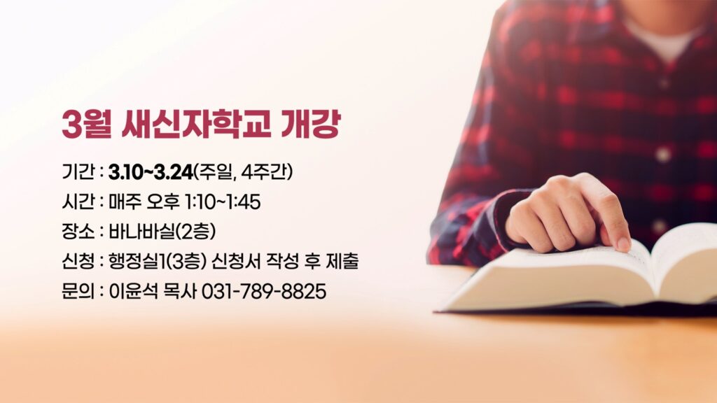 기간 : 3.10~3.24(주일, 4주간)시간 : 매주 오후 1:10~1:45장소 : 바나바실(2층)신청 : 행정실1(3층) 신청서 작성 후 제출문의 : 이윤석 목사 031-789-8825