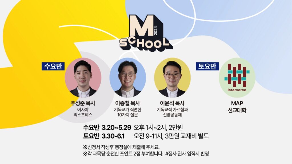 수요반이사야 익스프레스 - 주성준 목사기독교가 직면한 10가지 질문 - 이종철 목사기독교적 가르침과 신앙 공동체 - 이윤석 목사 토요반MAP선교대학 (Interserve) 수요반…