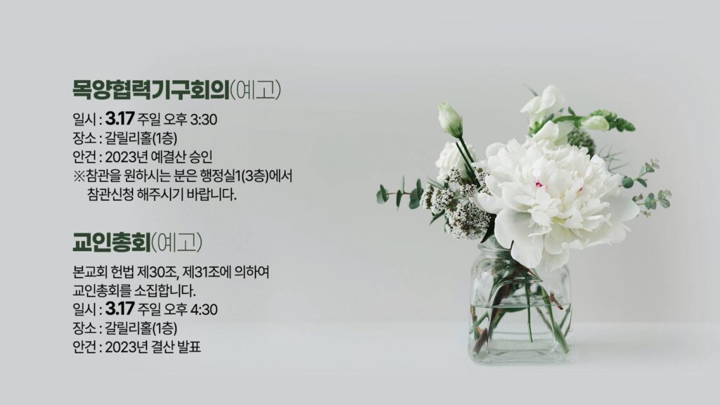 목양협력기구회의(예고)일시 : 3.17 주일 오후 3:30장소 : 갈릴리홀(1층)안건 : 2023년 예결산 승인※참관을 원하시는 분은 행정실1(3층)에서 참관신청 해주시기 바랍니다. 교인총회(예고)본교회 헌법…