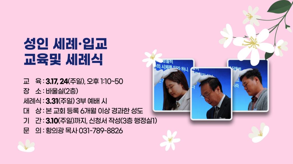 교육: 3.17,24(주일), 오후 1:10~50장소 : 바울실(2층)세례식 : 3.31(주일) 3부 예배 시대상: 본 교회 등록 6개월 이상 경과한 성도기간: 3.10(주일)까지, 신청서…