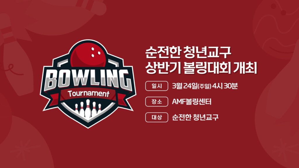 3월24일 순전한 찬양예배 후 청년교구 볼링대회! 일명 ‘청볼링’이 AMF볼링센터에서 진행 됩니다.청년이라면 누구나 참여할 수 있는 이번 대회를 통해 더욱 하나되는…