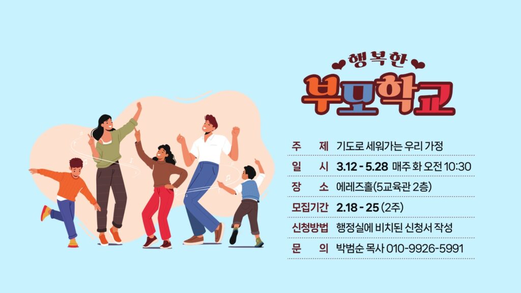 3월 12일 행복한 부모학교가 개강합니다.“기도로 세워가는 우리 가정”이라는 주제로 그리스도인으로서 부모의 정체성과 회복의 시간을 통해 삶으로 자녀를 양육할 수 있도록…
