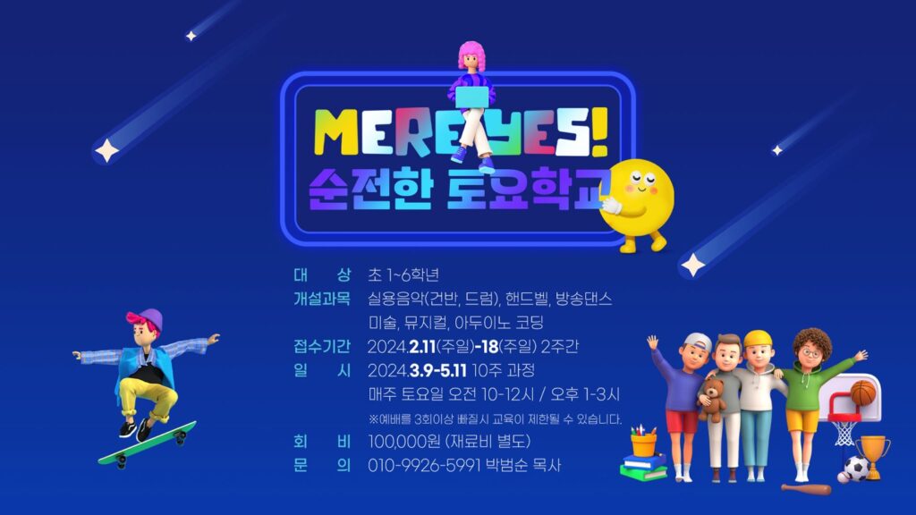 MERE YES! 순전한 토요학교가 곧 시작됩니다. 기독교 가치관으로 유익한 교육을 통해 순전한 다음세대를 세우고자 교회학교를 대상으로 실용음악(건반, 드럼), 뮤지컬, 방송댄스,…