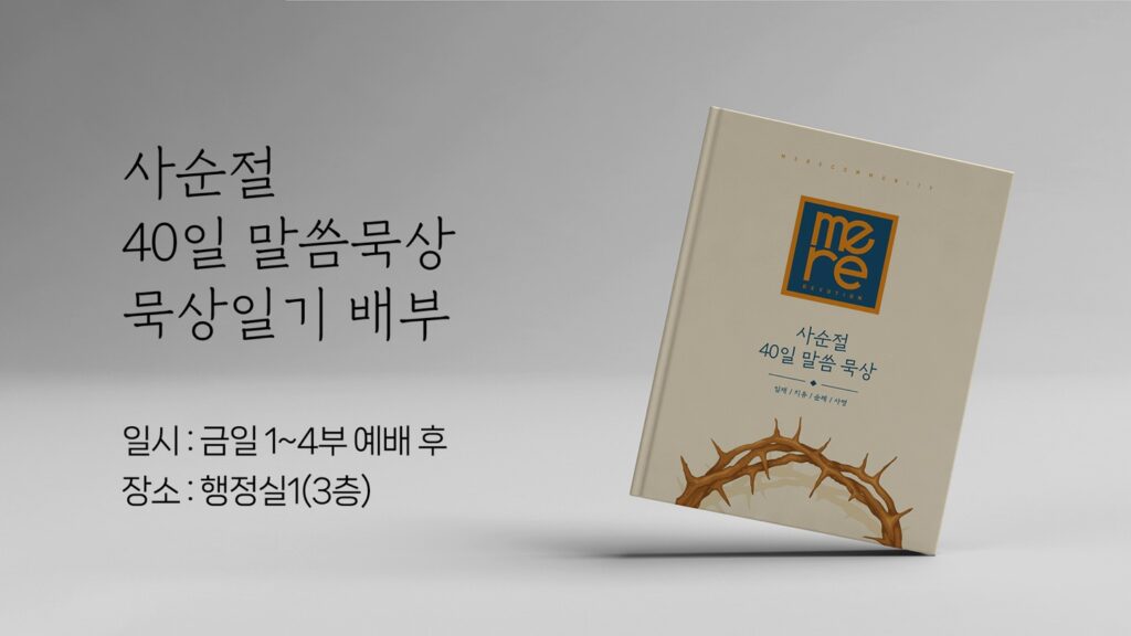 금일 1~4부 예배 후 행정실에서 사순절 말씀묵상과 묵상일기를 배부합니다. 매일 밤 9시 목회자와 함께하는 사순절 묵상이 유튜브를 통해 송출됩니다. 사순절…
