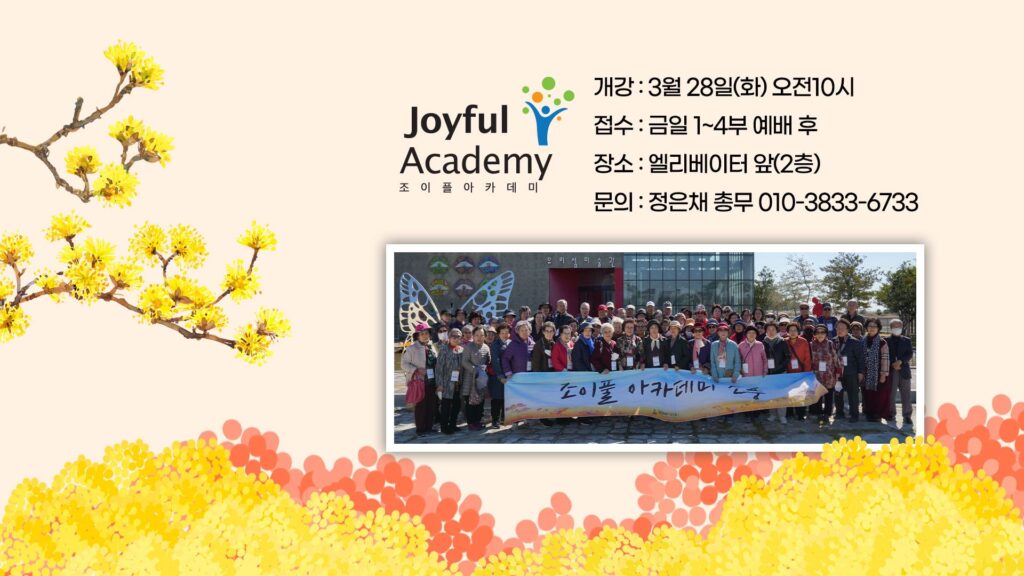 개강: 3월 28일(화) 오전 10시 접수 : 금일 1~4부 예배 후 장소 : 엘리베이터 앞(2층) 문의 : 정은채 총무 010-3833-6733