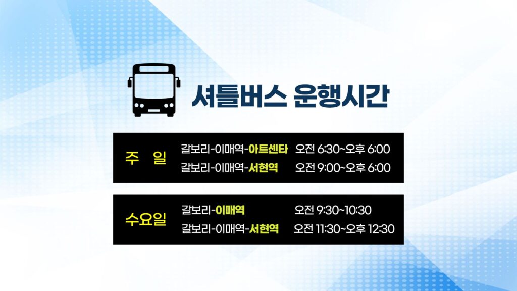 주 일 갈보리-이매역-아트센타 오전 6:30-오후 6:00 갈보리-이매역-서현역 오전 9:00~오후 6:00 수요일 갈보리-이매역 오전 9:30~10:30 갈보리-이매역-서현역 오전 11:30~오후 12:30